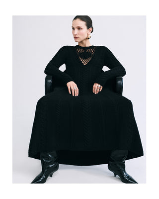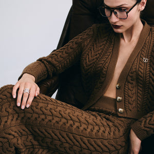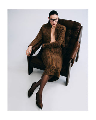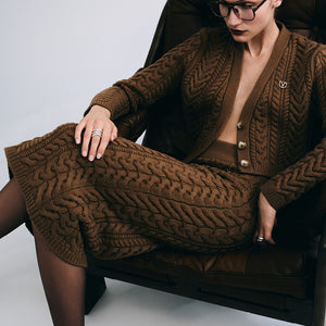 Bold texture meets sculpted form. Cable-knit cardigans, skirts, and dresses designed to adapt, balancing comfort, confidence, and quiet sensuality throughout the seasons.
