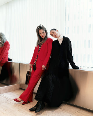 MAAYAN ZILBERMAN IN THE QUINN BLAZER AND ESME PANT, AND SARAH CLARY IN THE ROMY GOWN