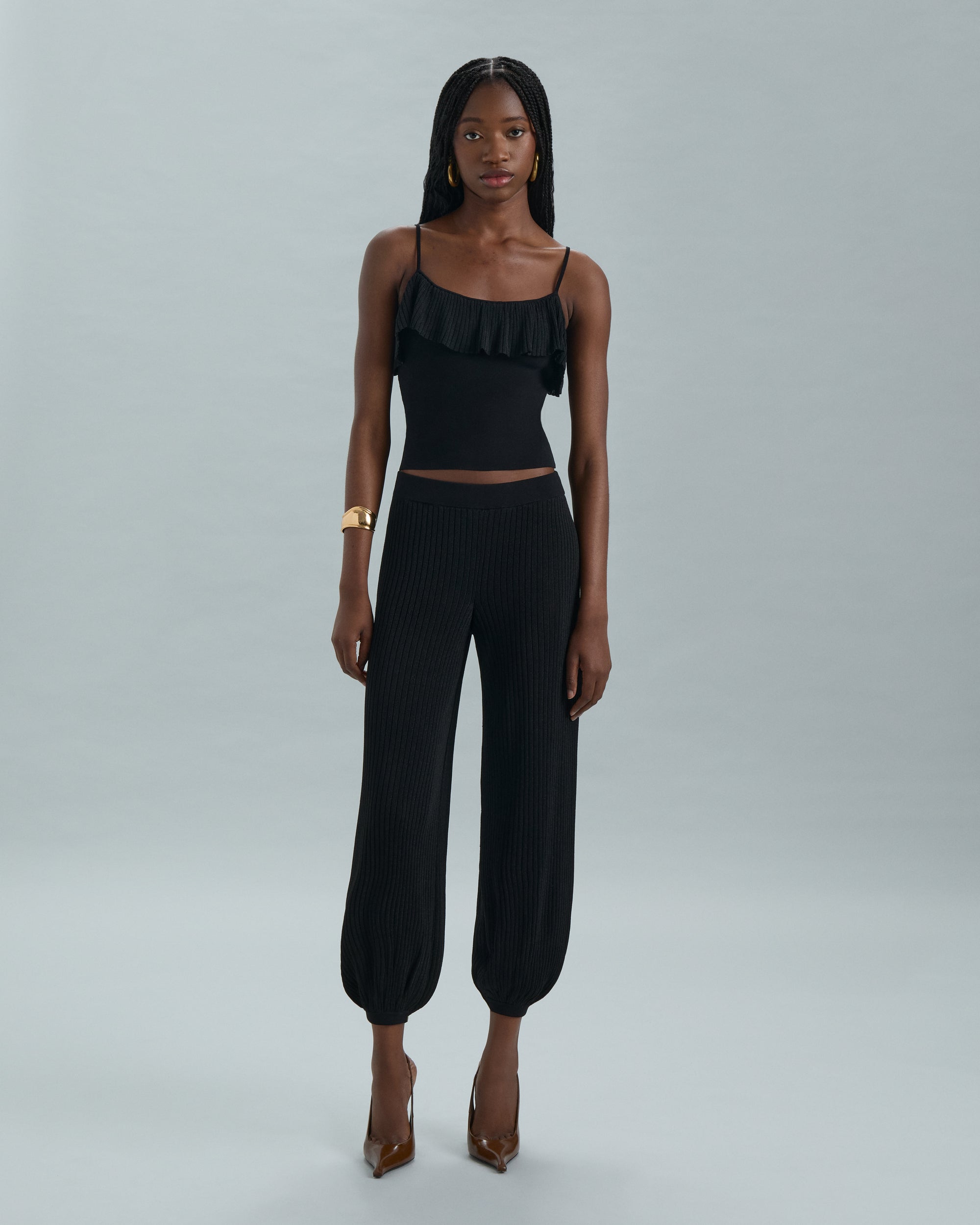 A fluid semi-sheer rib pant with soft shimmer, the WILLOW features an elasticated waist and bubble hem for an effortless, relaxed silhouette.